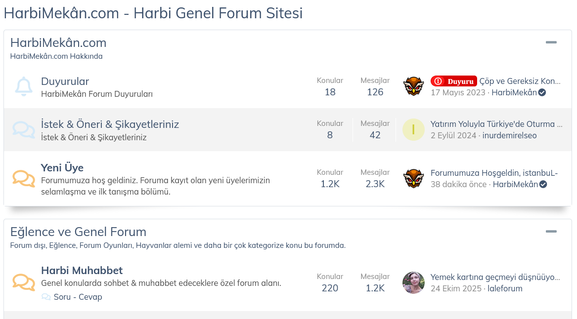 Forum sayfalarında kişilerin görüşleri ve paylaşımları değerlidir. Ortak bir bağ kurulan forum sayfalarında kişiler birçok konuda bilgiye erişme ve tartışma imkânı elde edebilir. Bu konuda en iyilerden biri ise HarbiMekân olarak bilinir ve uzun yıllar aktif olan bir forum sitesidir. Bireyler günlük olarak ziyaret eder ve günlük gelişmeleri, kişilerin fikirlerini okuyarak ve etkileşime girerek kendini daha iyi hissedebilir. Bunun yanı sıra kendi ilgi alanları ile ilgili konu açabilir, farklı kişilerle tanışarak çevre edinme imkanı elde eder.